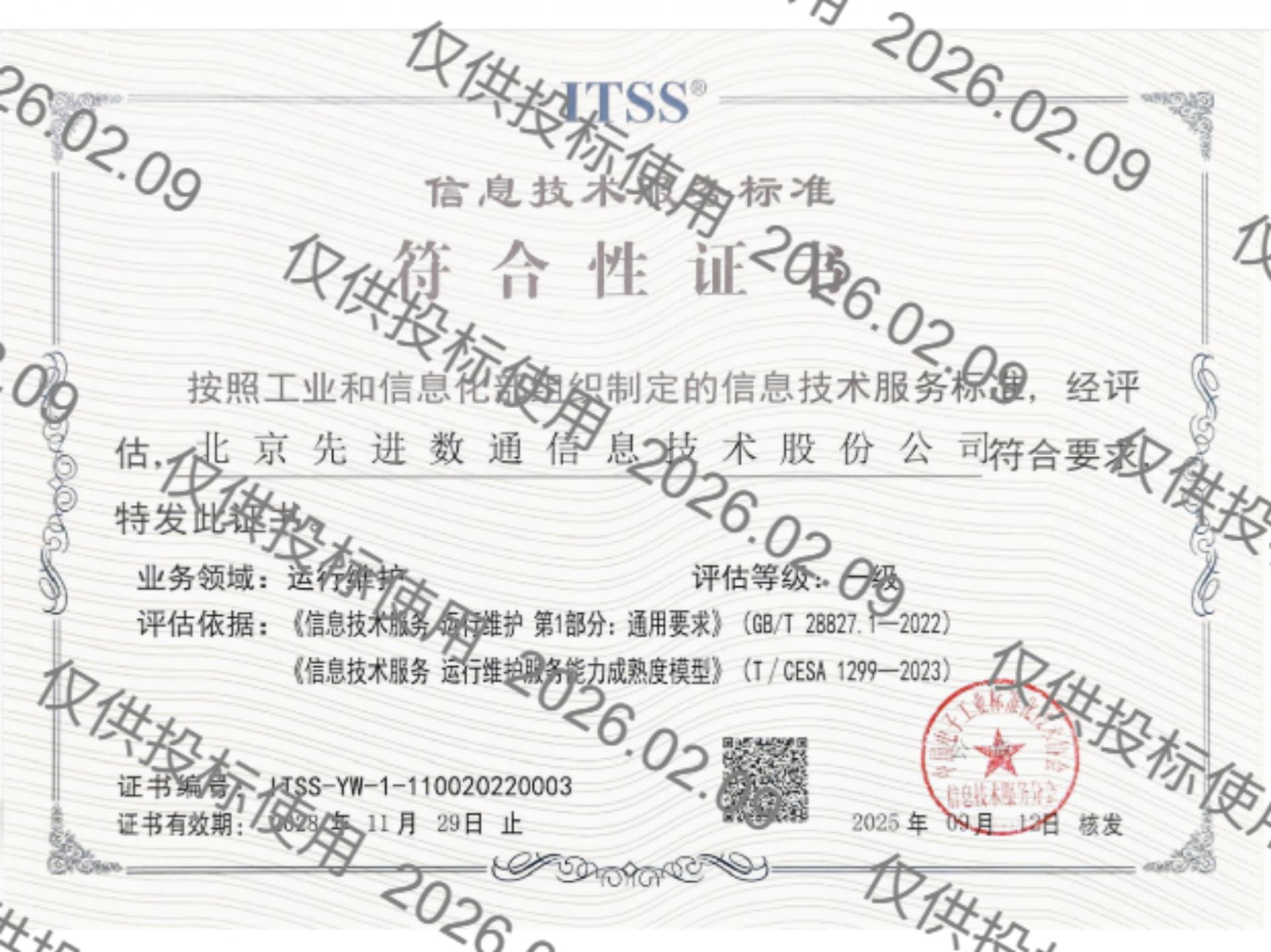 必一运动官网先后取得CMMIL5、软件能力成熟度五级(SPCA 5)、信息系统建设和服务能力评估体系(CS)5级、ITSS成熟度一级、信息系统安全集成服务资质二级、信息系统安全运维服务资质二级、国产化信息系统集成和服务能力评估四级(LS4)、北京市企业技术中心等资质认证,并取得ISO9001、ISO20000、ISO27001、ISO14001、ISO45001、ISO22301、ISO37001、ISO28001、GBT29490等标准体系认证,具备行业领先的技术开发、工程实施及服务保障能力。